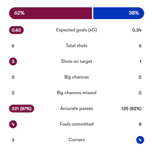 44’ – Grealish shot blocked for a corner. Torres slaps Tarky in the face in the build-up, but no action taken. Corner taken short to Myko on the edge of the box, but his delivery is awful.