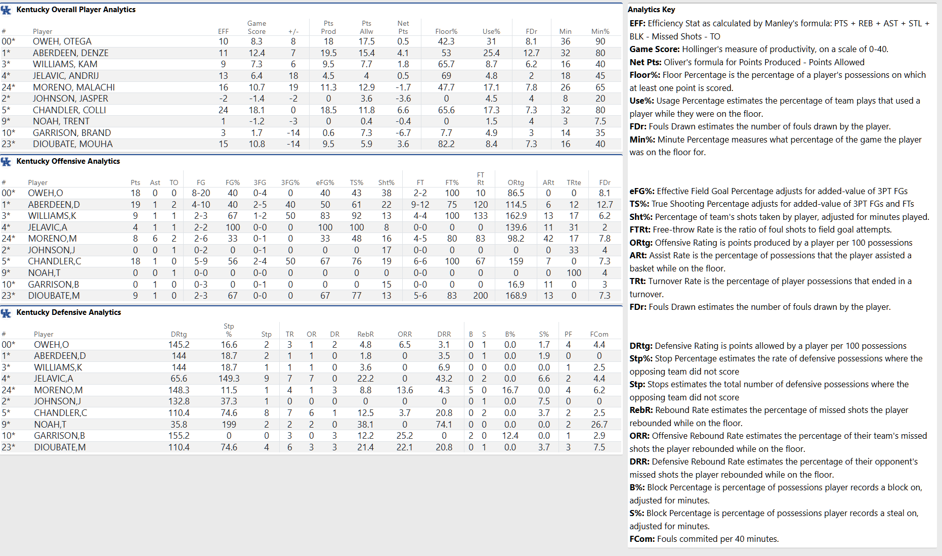 Malachi Moreno, making his first home start since his buzzer-beater at LSU last Wednesday, was all over the stat sheet in the first 20 minutes. Moreno had six points, three rebounds (all offensive), a team-high three assists, and two blocks.